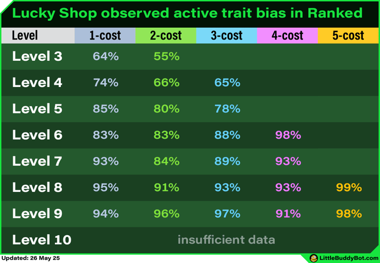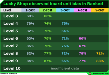 The table below from our Ranked data shows how often players were offered a lucky shop unit that was neither a board unit nor from an active trait when both were possible.
