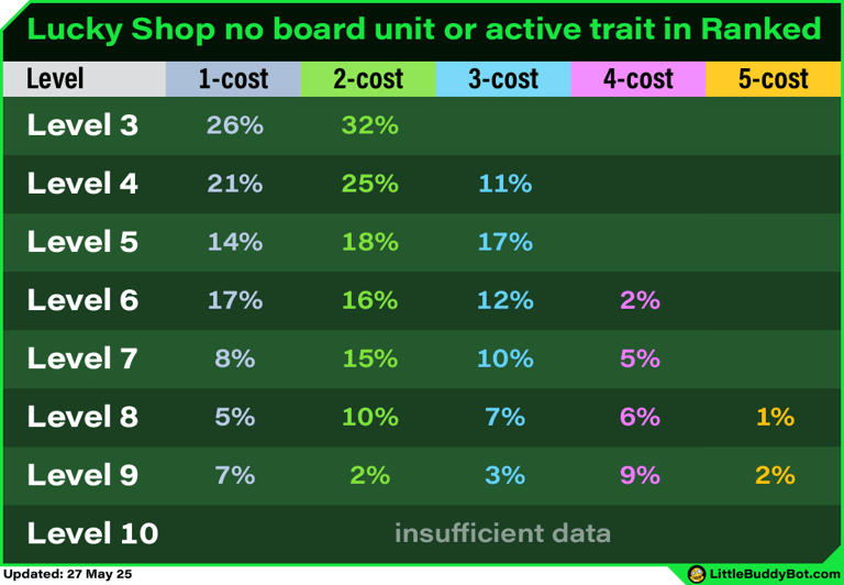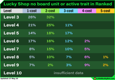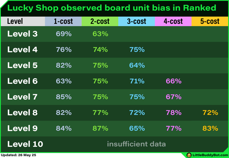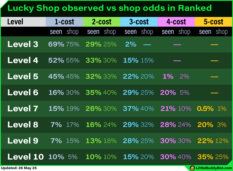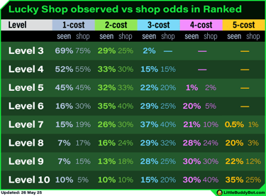 Lucky shops use the standard shop odds for level 3/4/5. However, certain rules take priority before rolling the cost of other shop slots. For level 6+, the shop odds are adjusted due to these rules.